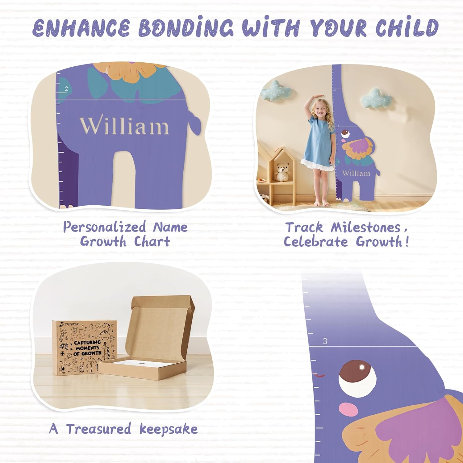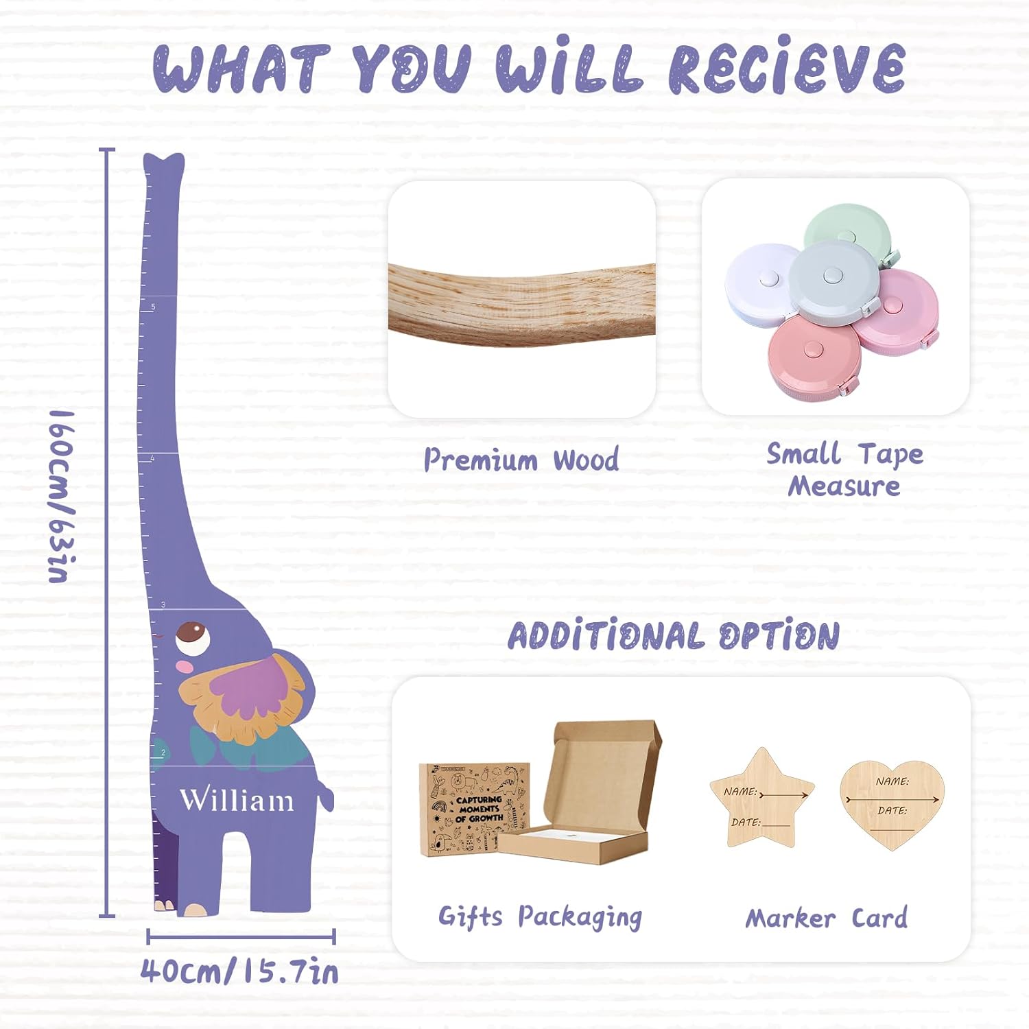 Personalized Name Growth Chart for Kids, Elephant Patchwork Wooden Height Chart for Wall Decor, Baby Boy Girl Measurement Ruler for Room 63" x 15.7"